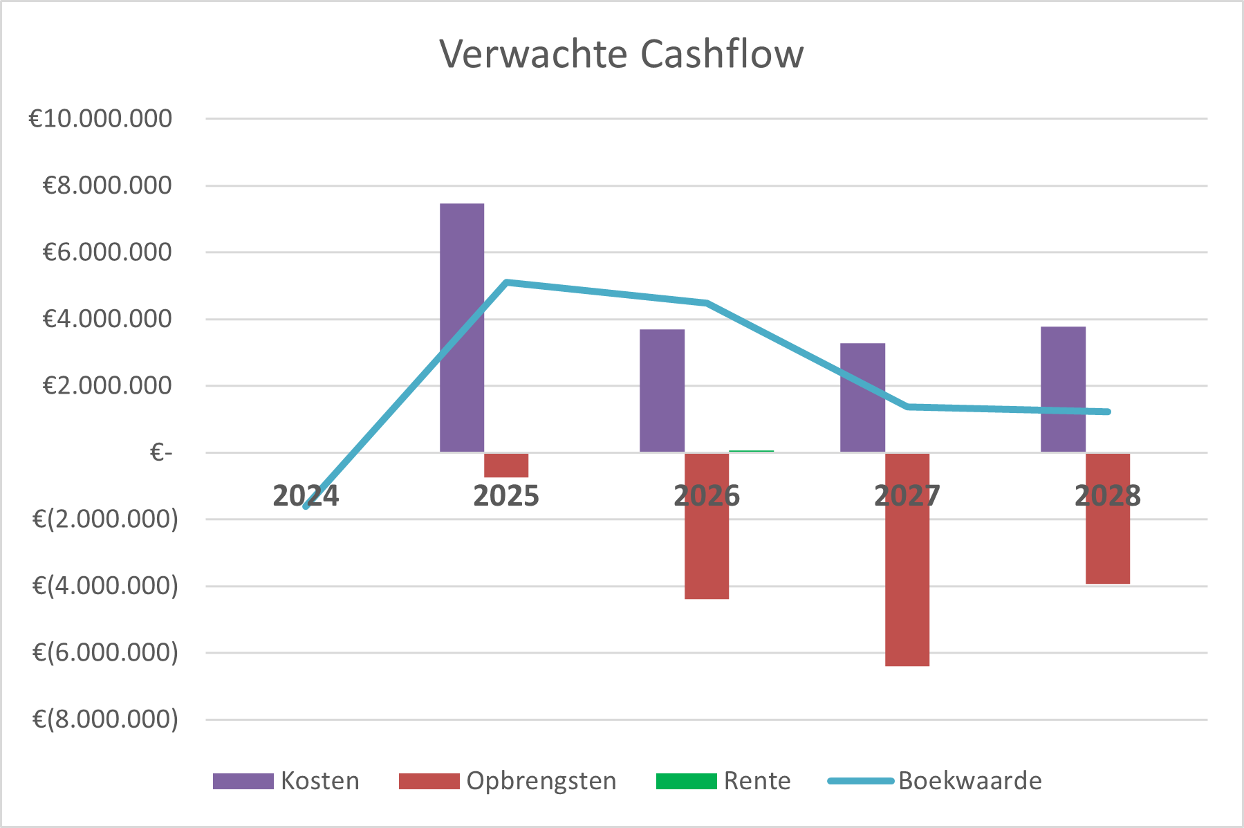 Terug naar navigatie - Grondbeleid - BoekwaardeIn onderstaande grafiek is het verwachte verloop van de boekwaarde weergegeven (Hierin is een negatief bedrag een positieve boekwaarde). Een positieve boekwaarde is gunstig omdat dan geen rentekosten betaald worden, maar juist worden ontvangen. In deze grafiek is de verwachte boekwaardeverloop van leesten Schouwbroek verwerkt.